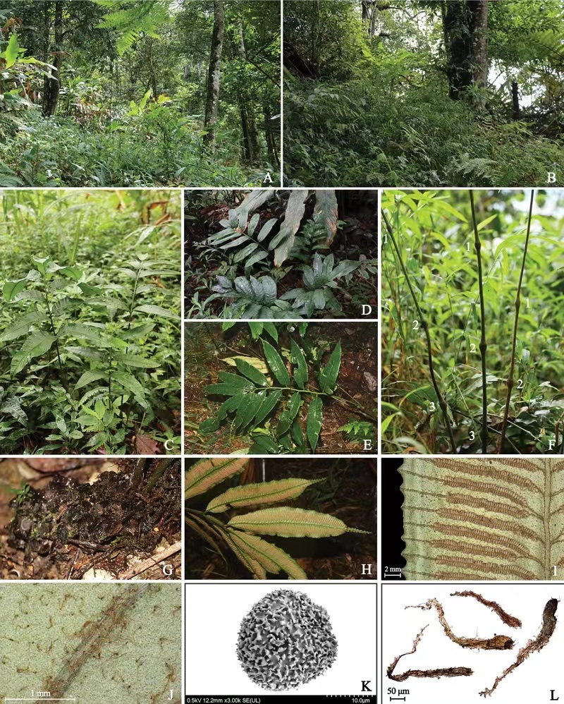 瘤柄观音座莲(图注:A, B 生境; C, D, E 叶片; F 叶柄; G 根状茎;H, I 孢子囊群;J 羽片背面,示节状毛; K 孢子纹饰;L 叶柄鳞片)。研究团队供图