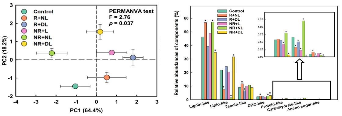 图:植物资源输入对热带原始林森林土壤DOM光谱性质(左)和不同功能组分相对丰度(右)的影响。