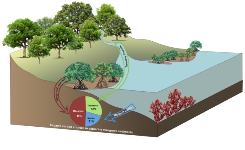 研究人员表示,在全球范围内,源自红树林的内源有机碳是河口和海洋红树林表层土壤有机碳的主要来源。河口型红树林沉积物中积累的海源有机碳少于陆源有机碳。河口红树林在沉积物中积累的有机碳比海洋红树林多,这可能主要是由于额外的陆源有机碳输入。