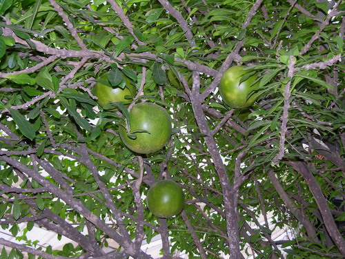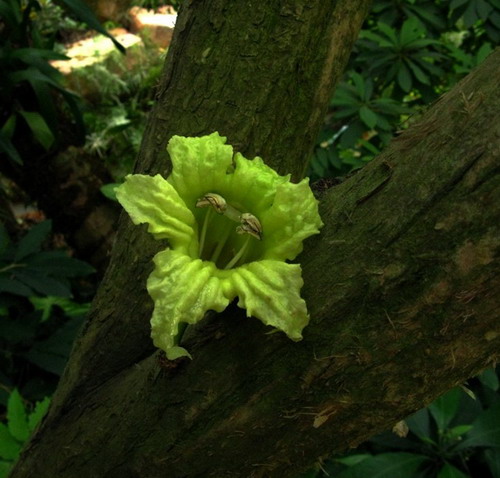 铁西瓜(Crescentia cujete L.)是紫薇科葫芦树属常绿小乔木。高可达10米,树干通直,树形舒展,少分枝。叶丛生,2-5片,大小不等,阔倒批针形。为典型的热带雨林“老茎生花结果”植物,花单生于小枝或老茎上,花冠钟状淡绿黄色,具褐色脉纹,四季开花;浆果卵圆状球形。