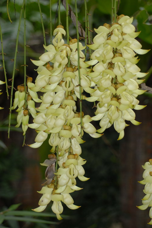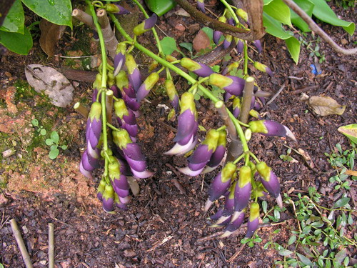 禾雀花(Mucuna spp.)属蝶形花科常绿木质大型藤本。它生长迅速,蔓茎粗壮,叶繁荫浓,茎长可达30米以上,生命力顽强,能盘树缠绕,越冠飞枝,攀石穿缝。鲜禾雀花味道甘甜可口,可作佐肴的时菜,还可伴肉类煮汤,煎炒均美味可口;晒干的禾雀花可以药用,是降火清热的佳品。