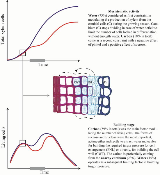 中科院华南植物园森林生态与模拟研究组黄建国研究员及其合作者通过研究在不同温度和水分处理下黑云杉幼苗树干形成层每周细胞分裂和木质部形成以及测量形成层和木质部中的非结构碳组分(蔗糖sucrose,葡萄糖glucose,果糖fractose,棉籽糖raffinose和D-松醇d-pinitol)的含量,用混合模型定量了非结构碳,水分和温度与形成层和木质部细胞数量的关系,发现表征分生组织活动的木质部细胞总数(木质部增大期细胞、细胞壁增厚期细胞、成熟细胞)是水分,蔗糖,和D-松醇的函数(conditional r2 =0.79),其中水分为主要限制因子(贡献率73%),碳次之(贡献率18%);发现形成层在干旱状态下会停止细胞分裂。而碳(其中23%的碳来自附近的形成层)则是活细胞总数(形成层细胞、增大期细胞、细胞壁加厚期细胞)的最大解释因子(conditional  r2 =0.49;贡献率59%),水则次之(贡献率15%),表明木质部发育过程中对能量的功能性需求。该研究首次精细区分了碳和水在木质部形成(包括分生组织活动和细胞分裂)中的交互作用及阐明了干旱抑制树木生长及死亡的生理机制。