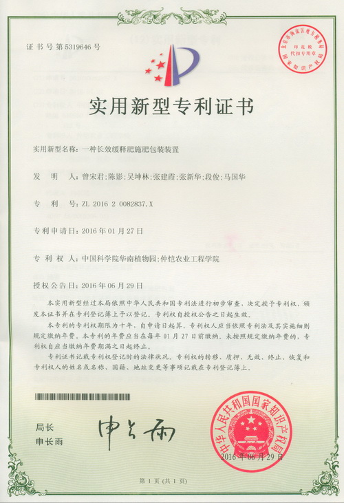 8月18日获悉,由中科院华南植物园曾宋君研究员等科研人员完成的“一种长效缓释肥施肥包装装置”获得国家实用新型专利授权(专利号:ZL 201620082837.X)。