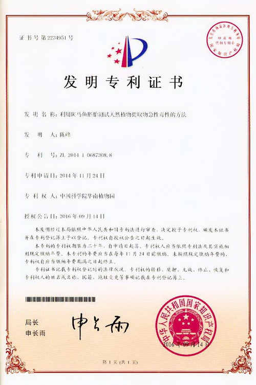 10月14日获悉,中科院华南植物园陈峰研究员完成的“利用斑马鱼胚胎测试天然植物提取物急性毒性的方法”获得国家发明专利授权(专利号:ZL201410687308.8)。