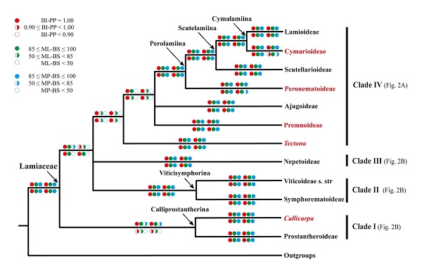 图1 唇形科的系统发育骨架。右侧黑色粗体表示的是Harley 等 (2004) 所界定的亚科(Ajugoideae, Lamioideae, Nepetoideae, Prostantheroideae, Scutellarioideae及Symphorematoideae)或Olmstead(2012)所界定的狭义的牡荆亚科 (Viticoideae),红色粗体表示该研究中确定的新亚科(Cymarioideae , Premnoideae , Peronematoideae)及亚科级别的分支(Callicarpa 和Tectona)。