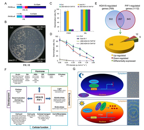 中科院华南植物园刘勋成研究员团队以模式植物拟南芥为研究材料,鉴定出一个关键的参与光调控种子萌发的抑制因子——组蛋白去乙酰化酶HDA15。遗传学分析发现,在拟南芥中突变HDA15基因促进光敏色素B(PHYB)介导的种子萌发,而在拟南芥中过量表达HDA15基因则抑制这一过程;同时,研究显示HDA15在遗传学上作用于PHYB下游,且HDA15抑制种子萌发依赖于一个关键的转录因子 ——PIF1蛋白。生化及转录网络分析显示,在远红光(或弱自然光)条件下,HDA15-PIF1在种子内发生蛋白互作,形成一个重要的转录抑制模块,共同抑制了包括赤霉素和生长素信号、以及细胞壁水解酶等与萌发密切相关基因在内的267个基因的表达。进一步研究表明,HDA15-PIF1模块通过组蛋白去乙酰化作用降低萌发相关基因的转录活性和表达,从而抑制种子萌发的起始;相反,在红光(或强自然光)照射下,活化的PHYB诱导HDA15-PIF1模块从萌发相关基因上解离,解除转录抑制,从而起始种子的萌发。