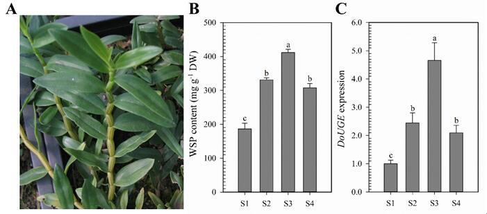 研究结果表明,铁皮石斛中的UDP-葡萄糖4-差向异构酶基因调控了茎中水溶性多糖的生物合成,同时可能还参与植株生长过程中对逆境的响应。相关研究成果已发表在国际学术期刊 Plant Cell,Tissue and Organ Culture(DOI: 10.1007/s11240-017-1308-2)上。
