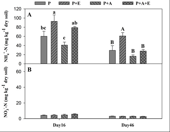 图2.微宇宙控制实验中不同处理下铵态氮(A)和硝态氮(B)的浓度。P仅栽种芒萁,P+E栽种芒萁并添加蚯蚓,P+A栽种芒萁并接种AMF,P+A+E栽种芒萁并同时接种蚯蚓和AMF。