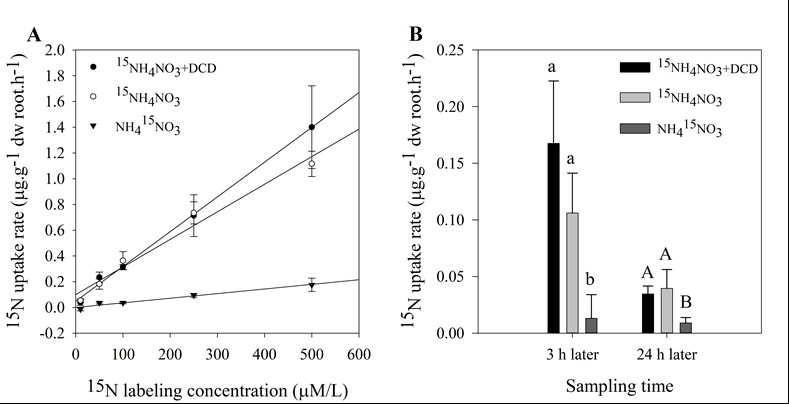 图1. 芒萁吸收铵态氮和硝态氮的速率:图A.15N标记芒萁根段实验,图B野外15N标记芒萁实验。