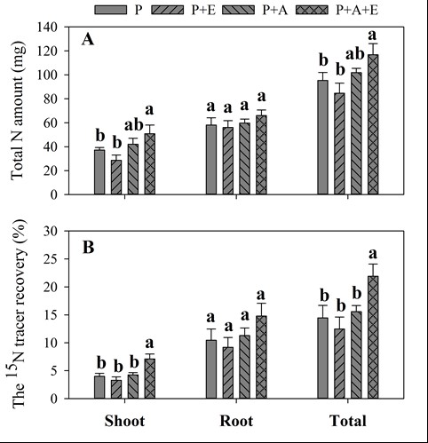 图3.微宇宙控制实验中不同处理下芒萁的总氮含量和15N标记物回收率。