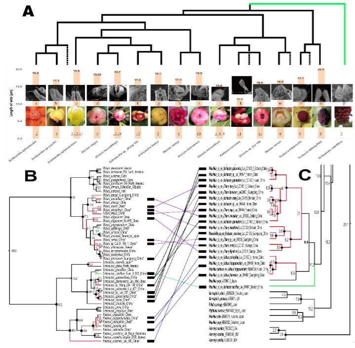 中科院华南植物园罗世孝研究员及其合作者,通过野外采样、观察与视频拍摄、电子扫描镜下性状分析、昆虫的形态与DNA条形码鉴定、协同分子系统树的构建及分子钟的分析首次从物种,群落和系统发育水平揭示了被子植物“第一个”专性共生传粉系统,即“五味子科植物与瘿蚊Schisandraceae- Resseliella midge”的演化与维持机制。