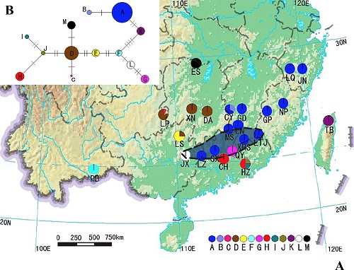 华南植物园物种保育多样性研究组在多年研究基础上,为了阐明当前的系统发育地理格局,推断伯乐树的历史种群动态,并为其保护提供建议,选择了跨越中国10个省份的23个伯乐树居群,共256个个体进行了谱系地理学研究,扩增了叶绿体DNA非编码区的三个片段rps8-rps11、trnQ-rps16、trnT-trnL。分析结果显示存在13种单倍型,展示了相对较高的总单倍型多样性(hT = 0.739)。遗传变异主要来源于居群间,占98.09%(P <0.001),居群内的遗传多样性只占1.91%(P <0.001)。在居群间检测到了强烈的遗传分化(GST = 0.855,P <0.001),和较低的种子流Nm = 0.09。分析结果显示中国现存伯乐树居群划分为五个地理组最合适:(1)云南东部至广西西部; (2)贵州–湖南–湖北; (3)广东中部; (4)广东西北部; (5)罗霄–南岭–武夷–阳明山。网络分析显示最古老的单倍型存在于第一组中,如云贵高原东部和云南东部,该地区可能是伯乐树的早期冰期避难所之一。伯乐树可能从这些避难所向东迁移扩张,并在中国东南部地区经历过瓶颈效应或奠基者效应。贵州黎平,广西龙胜,广东惠州,江西崇义,湖南东安,云南屏边和湖南新宁等地区的居群应给予优先保护考虑。
