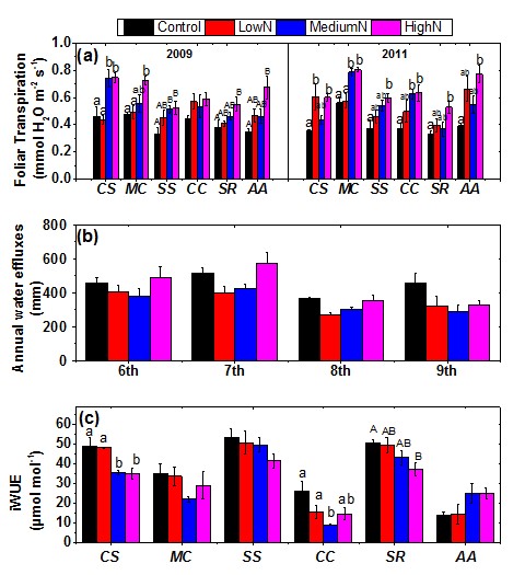 图2 长期氮沉降对乔木优势植物蒸腾(a)、土壤水分输出(b)和水分利用效率(c)的影响