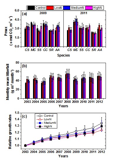图3 长期氮沉降对乔木优势植物光合能力(a)、月平均凋落物量(b)和森林植物相对生长速率(c)的影响