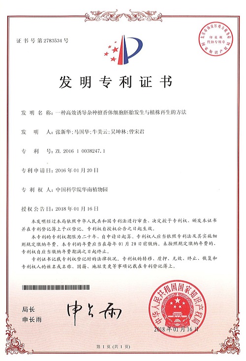 7月6日获悉,由中科院华南植物园张新华等科研人员完成的“一种高效诱导杂种檀香体细胞胚胎发生与植株再生的方法”获得国家发明专利授权(专利号:ZL201610038247.1)。