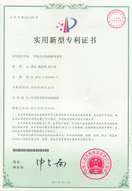 7月13日获悉,由中科院华南植物园龚亮等完成的“一种复合式果蔬解毒装置”获得国家实用新型专利授权(专利号:ZL 201620941841.7)。