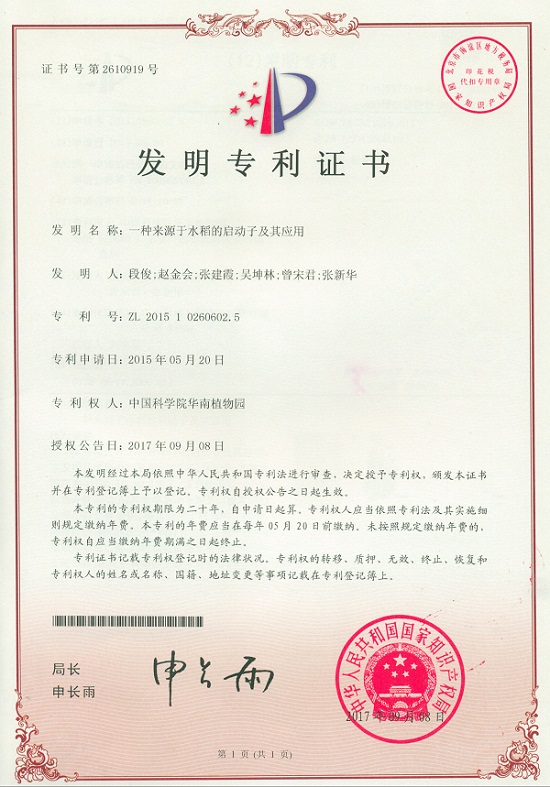 1月4日获悉,由中科院华南植物园段俊、张建霞等科研人员完成的“一种来源于水稻的启动子及其应用”获得国家发明专利授权(专利号:ZL201510260602.5)。