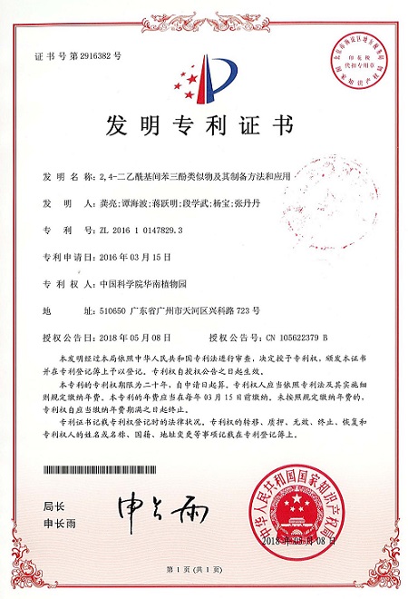 6月17日获悉,由中科院华南植物园龚亮等科研人员完成的“2,4-二乙酰基间苯三酚类似物及其制备方法和应用”获得国家发明专利授权(专利号:ZL201610147829.3)。