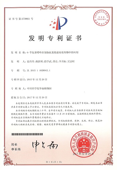7月19日获悉,由华南植物园张丹丹、蒋跃明等科研人员完成的“6-苄氨基嘌呤在制备抗荔枝霜疫霉药物中的应用”获得国家发明专利授权(专利号:ZL 201511028043.1)。