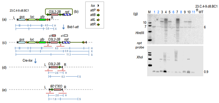 针对这个问题,华南植物园分子中心博士后陈伟强及前博士研究生Gurminder Kaur等在区永祥研究员的指导下,再次利用Bxb1和Cre重组酶系统尝试了新旧转基因的替换。在具有att和lox序列的多基因整合株系上(图中a),通过Bxb1-att系统首先叠加了一个带有新基因OsO3L2-2B和lox位点的载体(图中b)得到(图中c),然后利用Cre-lox重组技术,将旧基因簇 gus-gfp-luc和叠加载体上包括筛选标记npt在内的非必需序列全部删去,形成(图中d)或(图中e)的结构,即完成了新旧转基因的替换。由于完成替换后的株系还含有att和lox序列,这就意味着新基因的叠加和替换可以在需要时继续进行下去。这个转基因替换系统的出现大大增加了多基因分子育种的灵活性,而由于Bxb1和Cre重组酶的使用不受专利限制,更有利于此育种技术的自由使用并大大提高产品商品化的可能性。