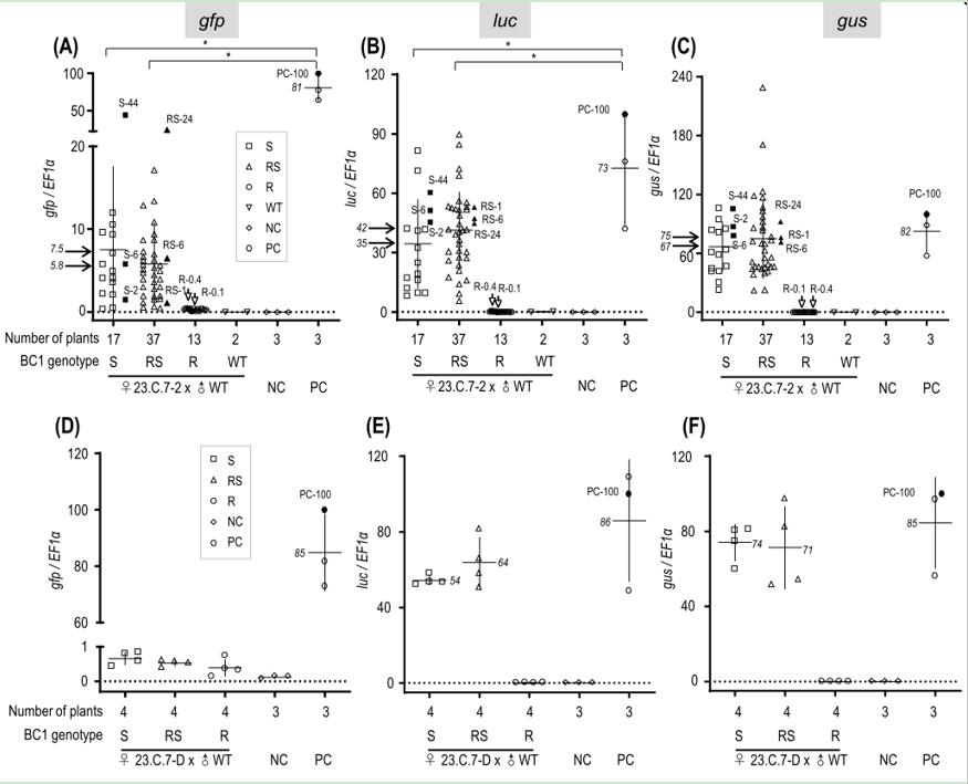 图. 沉默转基因(gfp)的表达激活以及它对其它定点整合转基因表达的影响。散点图所显示的为转基因gfp(A、D)、luc(B、E)和gus(C、F)的相对表达量。图中,23.C.7为具有定点整合和随机整合的两个gfp拷贝的植株,与其基因型相同的后代为23.C.7-2和23.C.7-D。在23.C.7-2和23.C.7-D回交的后代(BC1)中均包含S(含有单个定点整合gfp的植株)、RS(含有定点整合和随机整合的gfp的植株)和R(只含有随机整合gfp的植株)三种基因型。阴性对照(NC)为野生型。阳性对照(PC)为只具有一个相同结构的定点整合gfp的23.C.4植株回交的后代,这些后代也只有一个定点整合gfp。