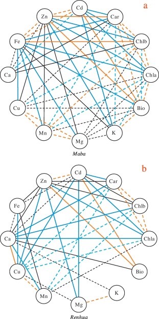 图2 不同植物叶片中元素的皮尔逊相关分析。