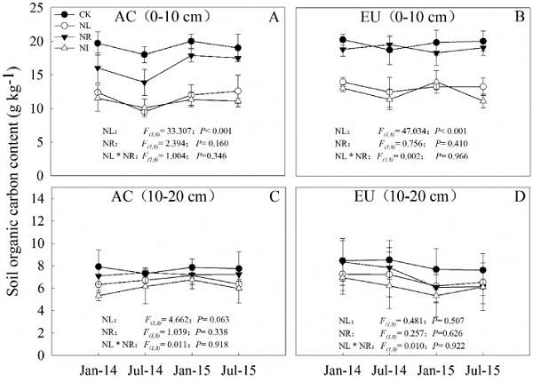 图1. 凋落物和根系去除对土壤有机碳的影响