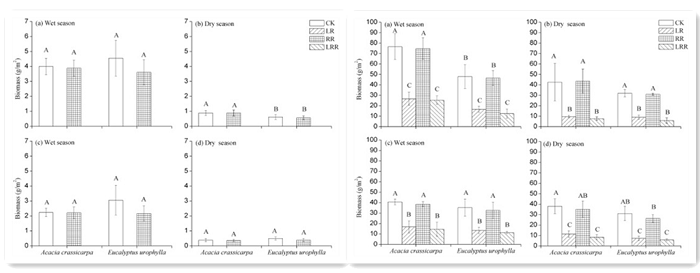 图2. 凋落物和根系去除对表栖类(左)和内栖类(右)蚯蚓生物量的影响