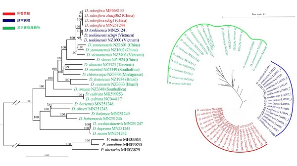 两个结果都表明降香黄檀和越南黄檀不同来源的样品聚成各自独立的分支且互为姐妹关系,代表着两个平行的进化谱系。