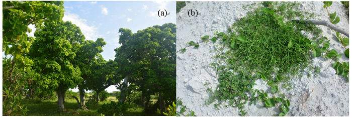 图1. 东岛中央区域的抗风桐林(a)和海岸边缘的草藤本植物群落(b)
