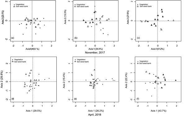 图2. 对中央-中间-海岸边缘3个区域的地上植被与土壤种子库的物种组成差异