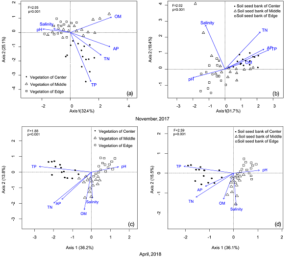 图3. 热带珊瑚岛中央-中间-海岸边缘区域植被、土壤种子库和环境因子之间的关系