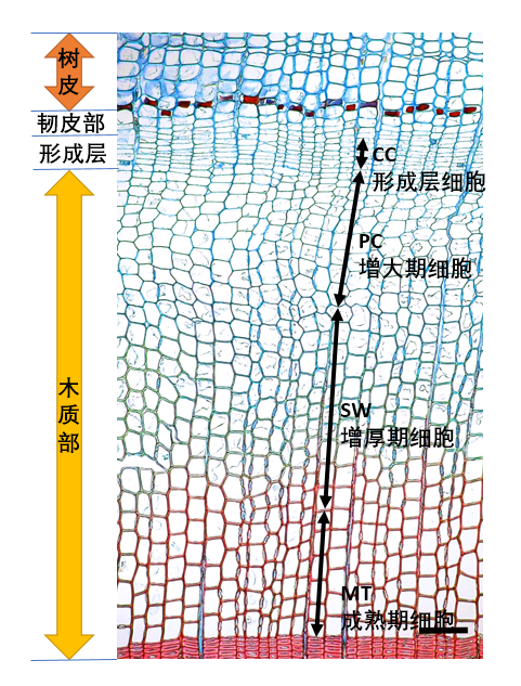 图: 树皮以下的形成层以及处于不同生长阶段(增大期、增厚期和成熟期)的木质部细胞。