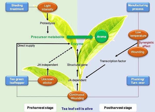 中科院华南植物园杨子银研究团队近年来系统解析了乌龙茶加工过程中香气的酶促形成机制。茶叶中含有大量的香气糖苷体,香气糖苷体的酶水解在早期一直被认为是茶叶加工过程中游离态香气形成的主要来源之一。研究团队首先探索了香气糖苷体酶水解是否参与乌龙茶香气的酶促形成,研究发现在乌龙茶加工过程的具酶活阶段,不存在糖苷水解酶和香气糖苷体接触并发生酶促水解反应,因此乌龙茶香气的酶促形成并非主要来自于香气糖苷体的酶水解(Gui等,2015)。为了进一步探索乌龙茶香气的酶促形成,曾兰亭博士系统地研究了乌龙茶香气的酶促形成与胁迫的关联性。与其他茶类相比,乌龙茶的加工过程保持细胞活体状态时间较长,且存在着多种胁迫因子,如采摘造成的损伤,萎凋造成的干旱、热和UV辐射,以及做青过程造成的连续损伤等。因此,乌龙茶是研究茶叶香气响应非生物胁迫的采后生物学基础理论的最佳材料(图1)。