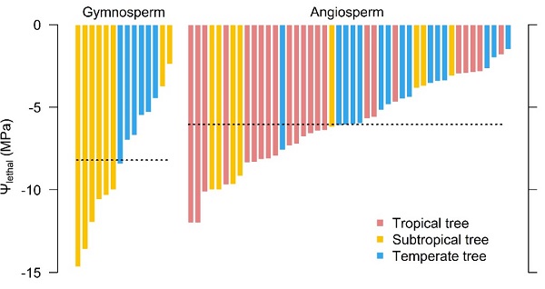 树木的水势是其水分状态的直接表征。树木能否在干旱中存活取决于其水势是否低于其死亡阈值(即致死水势),因而树木干旱响应预测模型必须包含致死水势这一重要参数。该研究分析了全球不同群系59个树种干旱死亡阈值的变异性,发现致死水势的分布范围为-1.5至-14.7 MPa(图1)。平均而言,针叶树的致死水势比阔叶树更低;对于阔叶树而言,热带、亚热带树木的致死水势比温带树木低。