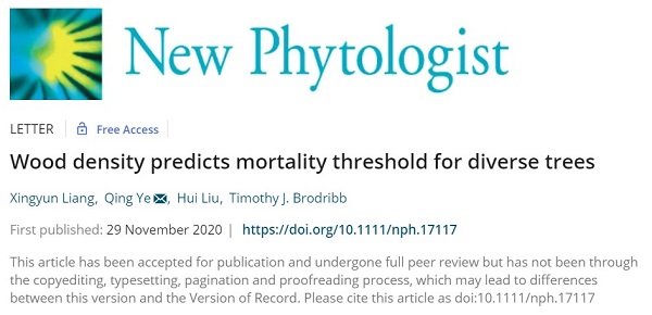 中国科学院华南植物园生态中心梁星云助理研究员在叶清研究员的指导下,定量了全球尺度不同群系树种的干旱死亡阈值,为气候变化背景下树木干旱死亡的理解和预测提供了新的见解。