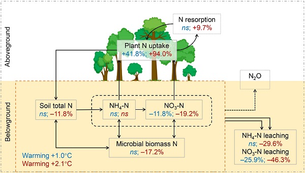 研究结果表明,增温可使富氮的热带森林生态系统氮循环更加封闭,这与增温背景下植物较高的氮需求和较低的土壤氮供应有关。该发现意味着增温背景下更封闭的氮循环可以减缓富氮热带森林中高氮沉降引起的生态系统氮损失,从而有利于该生态系统氮保持,但这种效应会随着增温时间延长而减弱。本研究系统地揭示了热带森林生态系统氮循环对增温的响应,同时探讨了氮循环封闭程度随增温时间的变化,研究结果有助于我们准确理解、评估和预测热带森林生态系统氮收支、初级生产力和生态系统对气候变暖进程的反馈。
