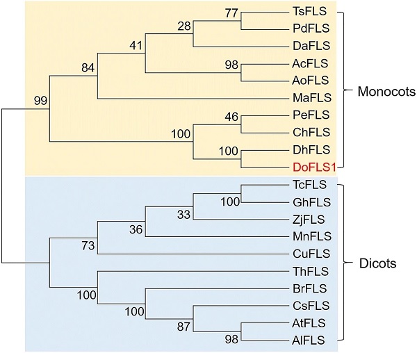 图1. 铁皮石斛DoFLS1与其他植物FLS的系统进化树分析。