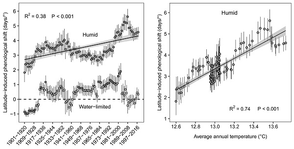 中科院华南植物园生态中心宋柱秋助理研究员,与海南大学及北京师范大学科研人员开展合作,利用多年生兰科草本植物绶草(Spiranthes sinensis)的开花物候数据,调查了气候变暖对开花物候纬度格局的影响。物候数据提取自标本和野外照片,有长达117年(1901-2017)且覆盖了东亚近40个纬度(21°N?60°N),非常适合该主题的探讨。研究结果主要包括:(1)整体上,开花时间随纬度显著变化,平均值为2.93天/纬度,即每增加10个纬度,开花时间推迟约1个月;(2)在水分受限制的地区,开花物候与纬度并不存在显著相关性(图),即在相近时间开花,并且也不受气候变暖影响;(3)在湿润地区,开花物候随纬度显著变化,并且气候变暖显著增加了纬度间开花时间的差异,年均温每升高1摄氏度,纬度间开花时间差异将增加2.47天/纬度;进一步的分析表明,气候变暖促使湿润区开花物候纬度间差异的增大,很可能是物候温度敏感性的纬度格局所致;(4)此外,气候变暖对开花物候纬度间差异的增大,在低纬度更加显著。这些结果表明,气候变暖对开花物候纬度格局的影响在湿润区和非湿润区存在显著的差异,因此气候变暖将与全球降水的变化协同地影响着植物的开花物候;而气候变暖显著增加湿润区的开花物候纬度间差异,可能会减少不同纬度间种群的基因流,从而加速物种分化,并且在低纬度地区更加显著。