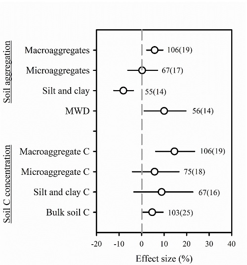 中科院华南植物园生态中心侯恩庆博士在旷远文研究员的指导下,联合南京大学科研人员,分析了中国陆地生态系统76个N添加实验数据,评估了N富集对土壤团聚体及其碳固存的影响。结果表明,N素富集显著增大了土壤颗粒的平均重量直径(+10%),提高了大团聚体比例(+6%),但降低了黏粉粒比例 (-9%)。在所研究的生态系统中,大团聚体碳含量对N素富集响应(+15%)均大于非根际土壤碳含量(+5%),但微团聚体和黏粉粒碳含量对N富集的响应不显著,且N富集对土壤团聚体效应值大小因生态系统类型和施肥策略而异。此外,N富集导致的土壤pH值持续下降与土壤团聚体碳含量密切相关。N素富集通过提高大团聚体碳含量、酸化土壤和抑制微生物对土壤有机质分解途径促进颗粒有机碳的积累。研究推论,大气N沉降可促进中国陆地生态系统土壤团聚体的形成及其固碳效应。