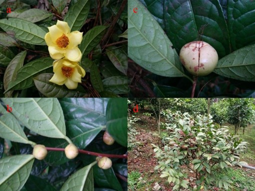 图1. 龙州金花茶的花(a);芽(b);果实(c);植株(d)。