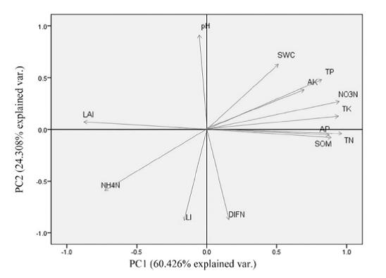 图2. 影响龙州金花茶丰度的环境因子主成分分析结果。