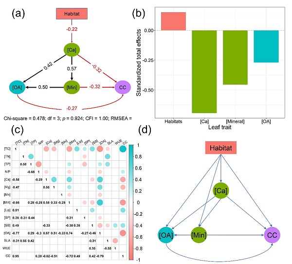 图2. 优势树种通过提高叶片Ca含量并影响叶片有机酸(OA),矿物质(Min)和叶片构建成本(CC)来适应喀斯特生境。