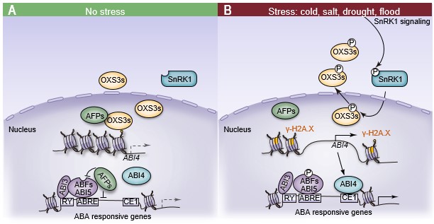 中科院华南植物园农业与生物技术研究中心的区永祥研究员团队在早期研究中发现OXS3(OXIDATIVE STRESS 3)家族蛋白的一些成员在植物响应重金属和氧化还原胁迫中起着重要的作用。为明确OXS3(OXS3和OXS3-LIKE蛋白: O3L1、O3L2、O3L3、O3L4、O3L5、O3L6;图1)家族中各个蛋白的功能,该团队对相关基因的拟南芥突变体进行了表型分析。令人意外的是,OXS3家族基因的一些多突变体对植物激素ABA呈现出敏感表型(图2),这意味着OXS3家族蛋白很可能参与ABA的信号转导调控。为此,研究人员综合运用CRISPR、酵母双杂交、染色质免疫共沉淀和启动子活性检测等多种技术手段,阐明了拟南芥OXS3家族蛋白与ABA信号转导的关系,并提出了一个相关的模型:当植物未受环境胁迫时,OXS3家族蛋白与AFP1(ABI FIVE BINDING PROTEIN 1)互作以减少组蛋白γ-H2A.X在ABI4 (ABA INSENSITIVE 4)启动子上的占位并降低ABI4表达量,从而抑制ABA信号转导。同时,AFPs(包括AFP1)可以加速ABI5降解并与染色质修饰因子抑制ABA响应基因转录,使ABA信号转导途径关闭(图3 A)。当植物受到胁迫时,ABA响应蛋白SnRK1(SNF1-related protein kinase 1)能磷酸化OXS3家族蛋白,使它们从细胞核转移至胞质中。当细胞核中的OXS3蛋白减少,γ-H2A.X在ABI4启动子上的占位便随之增加,从而解除对ABI4的表达抑制,激活下游的ABA响应基因表达(图3 B)。