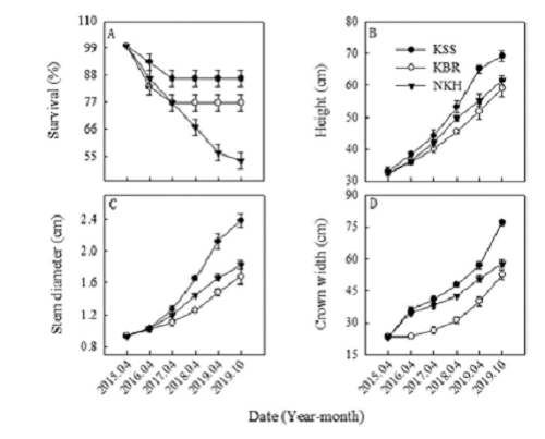 中科院华南植物园任海研究员与广西植物研究所唐辉课题组等,合作开展地枫皮的保护性回归研究工作。研究人员在进行野生种群及其生境调查的基础上,成功繁殖了苗木,再将苗木移植到带土壤的喀斯特斜坡(KSS)、喀斯特裸岩(KBR)和非喀斯特丘陵(NKH)生境中,并将其与原分布点的野生地枫皮个体进行对比研究。结果表明:移植在带土壤的喀斯特斜坡点的地枫皮的成活率、株高、茎直径、冠幅和总生物量远远高于另两个点的地枫皮,带土壤的喀斯特斜坡点的地枫皮的繁殖性状也普遍优于另两个点的地枫皮(图2)。但是,喀斯特裸岩点的地枫皮不同部位药用成分含量(槲皮素和厚朴酚)高于带土壤的喀斯特斜坡点的地枫皮,带土壤的喀斯特斜坡点的又高于非喀斯特丘陵点的。