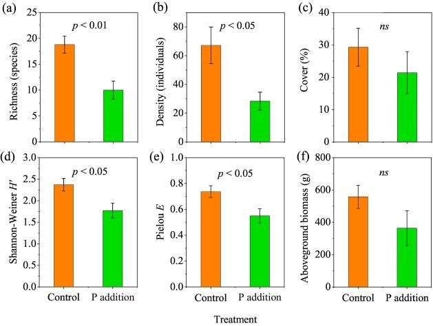 图2. 长期磷添加降低林下层植物的丰富度和多样性