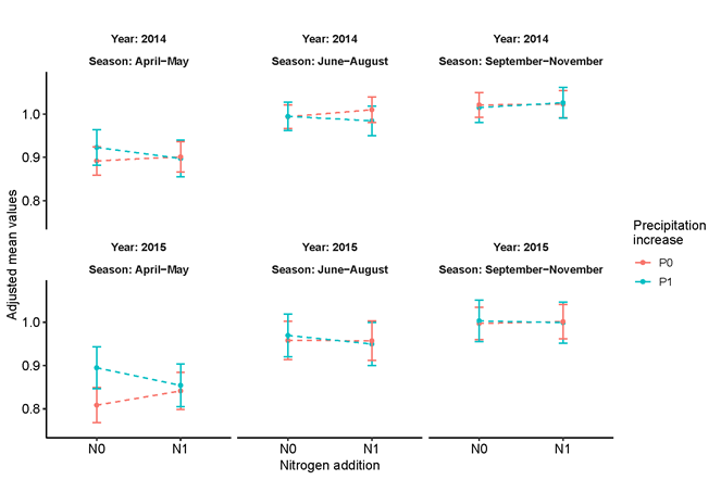 图1. 氮添加和降雨量增加的季节交互效应。