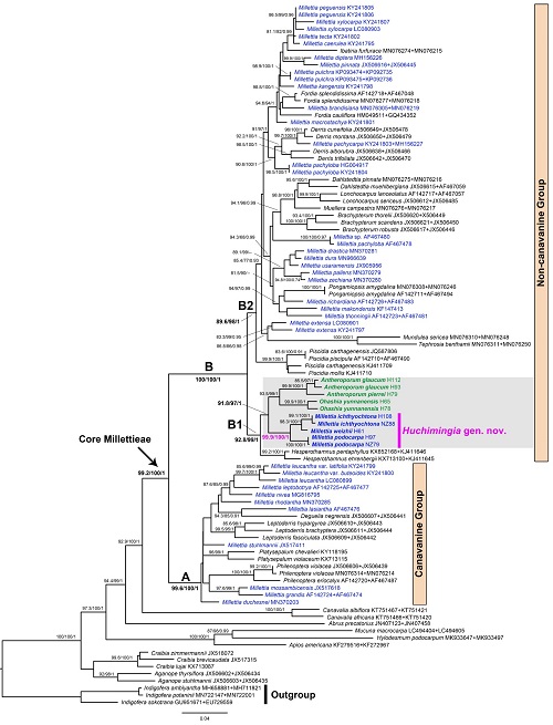 然而,崖豆藤属是一个高度异质性的属,这一点早在20余年前就已被发现(Hu et al. 2000)。因此,在Dunn (1912)承认的16个组中,4个组随后被其他学者提升为属:白花组(Millettia sect. Albiflorae Dunn)、小苞组(M. sect. Bracteatae Dunn)分别被Geesink (1984)处理为白崖豆属(Imbralyx R. Geesink)和内翅豆属(Endosamara R. Geesink);澳洲组(M. sect. Austromillettia Dunn)被Compton (2019)提升为澳腰豆属(Austrocallerya R. Geesink);宽序组(M. sect. Eurybotrtae Dunn)被Compton (2019)处理为3个属:鸡血藤属(Callerya Endl.)、南海藤属(Nanhaia J. Compton & Schrire)和夏藤属(Wisteriopsis J. Compton & Schrire)。白崖豆属被置于刀豆氨酸群(canavanine group)中,与多数崖豆藤属物种不同,后五属现属于紫藤族(Tr. Wisterieae X. Y. Zhu),与崖豆藤族演化关系甚远。