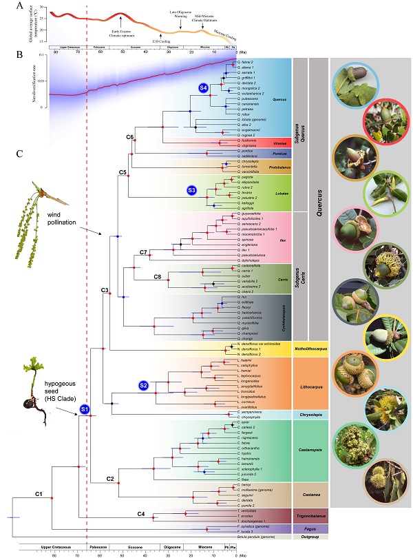 由中科院华南植物园王宝生研究员和杜克大学Paul S. Manos教授领导的研究团队,利用系统基因组学和群体遗传学研究方法揭示了壳斗科植物的系统发育关系、分化历史以及种间杂交的遗传效应。研究发现,壳斗科植物从白垩纪末期以来经历了多次快速分化。综合分析形态特征的演化模式、种子传播者出现时间以及古气候数据,证实了响应环境变化的性状创新和动植物的协同进化是壳斗科物种多样性产生的重要推动力。同时发现,壳斗科植物物种间发生过频繁的古杂交事件,导致核基因树与叶绿体基因树之间存在强烈的冲突。进一步通过单倍型分析与基因功能注释,证实了古杂交事件导致的基因渐渗具有重要的适应性意义。