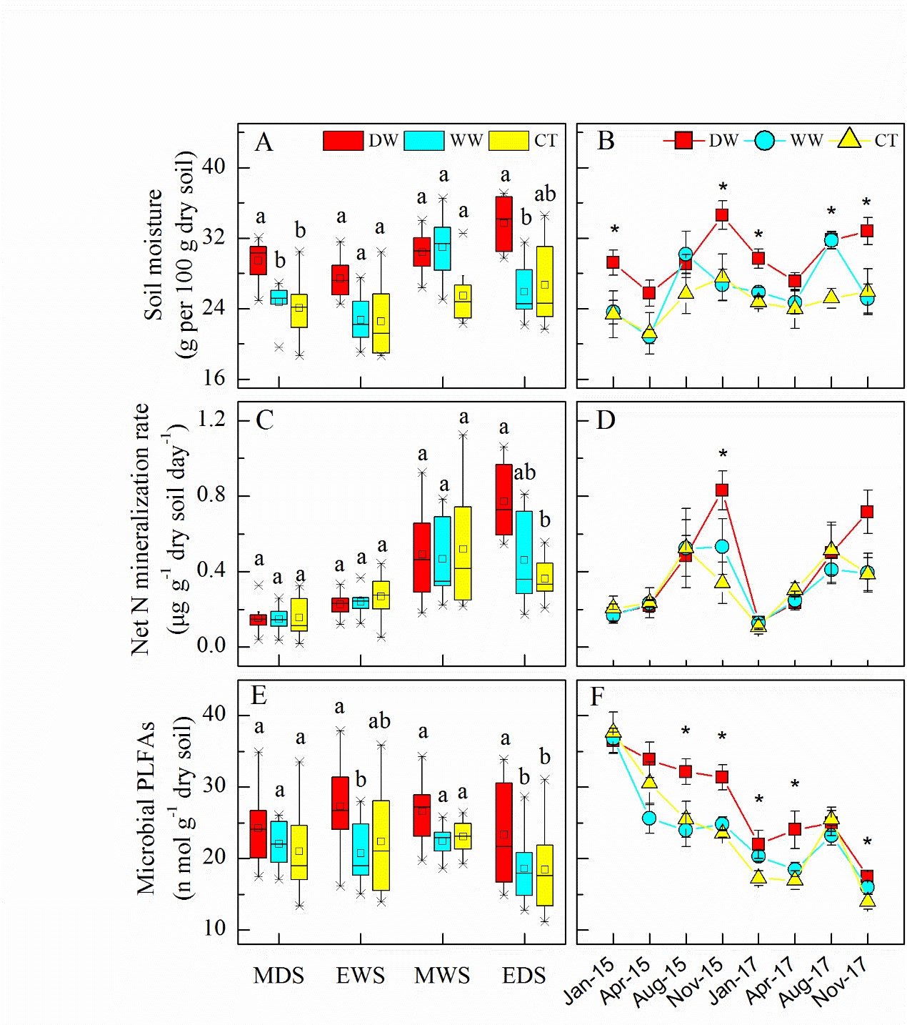 图1 降水变化在各季节(ACE)和各次采样(BDF)对热带季风林土壤含水量(AB),土壤氮净矿化速率(CD)及土壤微生物磷脂脂肪酸含量(EF)的影响